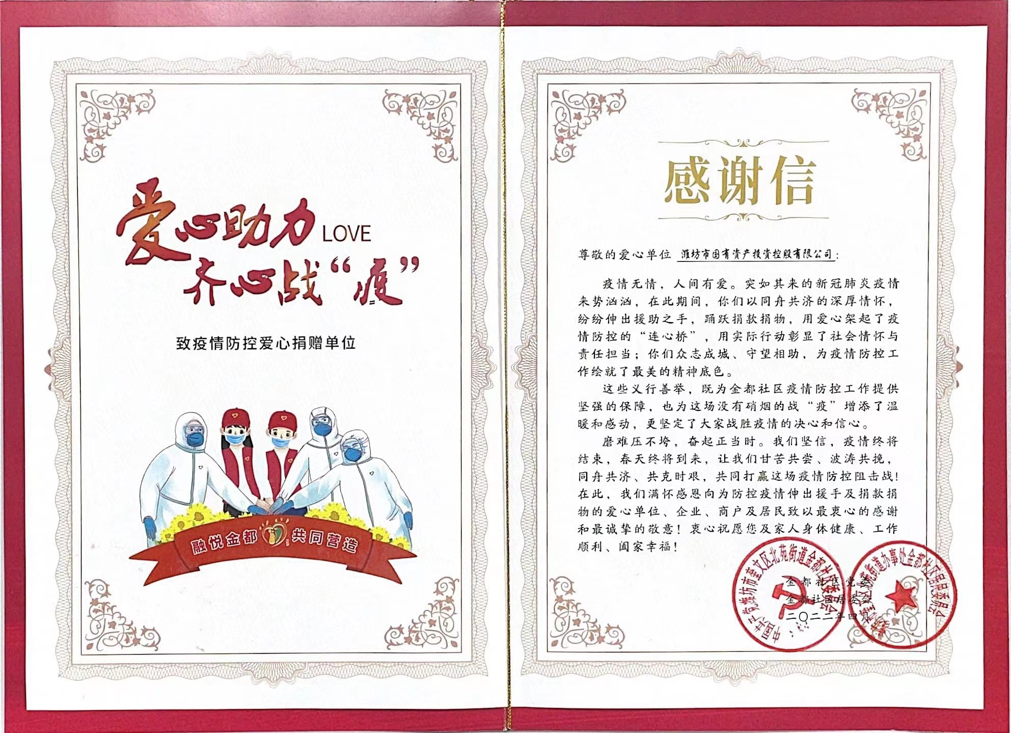 5月7日,市國(guó)投公司收到了一封來自金都社區(qū)的感謝信,信中對(duì)市國(guó)投公司第一時(shí)間馳援社區(qū)疫情防控工作,積極協(xié)調(diào)捐贈(zèng)抗疫物資等志愿行動(dòng)表達(dá)了衷心的感謝。截至目前,公司向社區(qū)捐贈(zèng)醫(yī)用口罩、酒精、醫(yī)用手套、方便面等抗疫物資價(jià)值6000余元,前后5次通過電聯(lián)、...